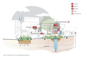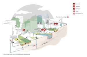 Ngược lại, mô hình đô thị tự cường đề xuất hệ thống hạ tầng nước phân tán, trong đó mỗi đơn vị không gian – từ mái nhà, sân trong, vỉa hè đến các công viên nhỏ – đều tham gia vào chu trình nước bao gồm: