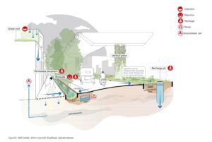 Nước mưa được xử lý linh hoạt theo cao độ mực nước ngầm: khi mực nước nông, nước được lọc và thấm tự nhiên; khi mực nước sâu, nước được giữ lại để điều tiết. Cách tiếp cận này giúp giảm áp lực lên hạ tầng kỹ thuật, đồng thời cải thiện chất lượng sống và khả năng tự phục hồi của đô thị.